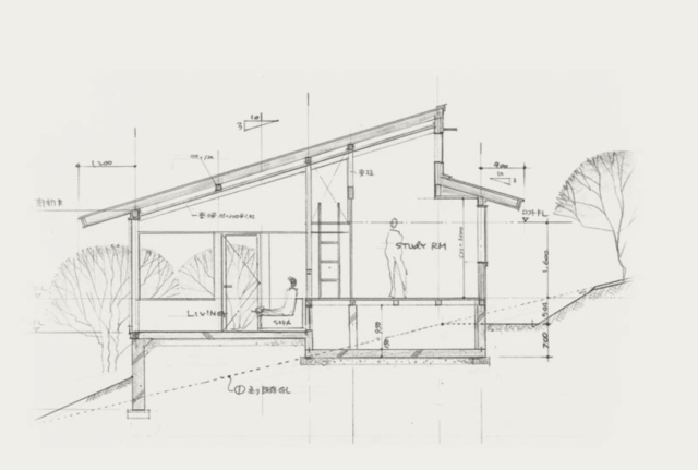 「Mimicry Style」 MS-5の原型となった「雲隠れの家」。まもなく完成から10年が経ちます。 3/10勾配程度の急傾斜地に建つ平屋。2LDKに屋根のかかったデッキ、そしてロフトの書斎があるコンパクトながらも豊かな家です。 傾斜を利用したスキップフロアとなっています。