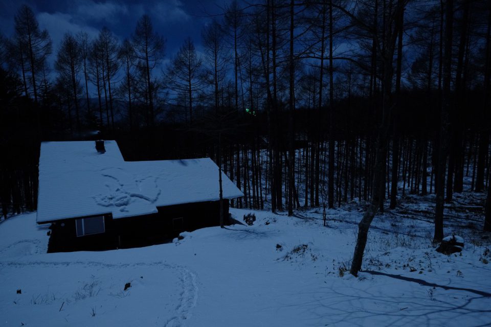 「鹿谷にひらく家」のオーナーから届いた一枚の写真。 雪と満月と晴天。 条件が揃い目の前には幻想的な世界が広がっています。 谷に臨む茂みの中で鹿の親子が寝ています。 細田@PDO