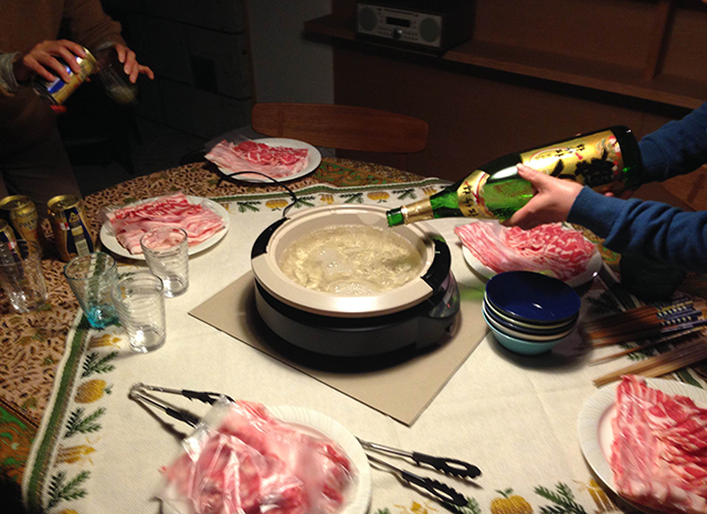 夕食にいただいたのは「常夜鍋」と呼ばれる豚しゃぶでした。あろうことか、金箔入りの松竹梅大吟醸を鍋並々に・・・。あぁ・・・・。