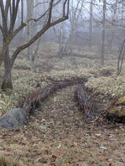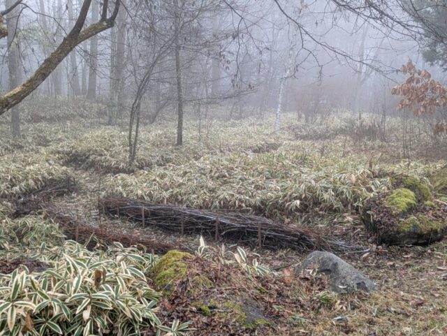 支えに入れている杭も間の枝も、やがて朽ちていきますが