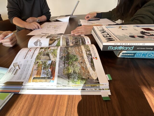 お引き渡しの終わった「カフェレーサーの家」 春からの造園植栽計画の打ち合わせをしました。アスファルトの車路の入り口には、アクセントで低めに自然石の小端積みをします。水平ラインを強調する効果もあります。 植栽はカツラやヤマボウシ、ハウチワカエデ、ジュンベリーなどを予定しています。 建築工事の中で粗造成をした土の部分は、植栽なども意識しながら自然な感じに仕上げていきます。