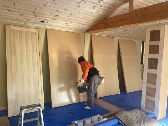 現場では木製建具が搬入されて、塗装工事が行われています。