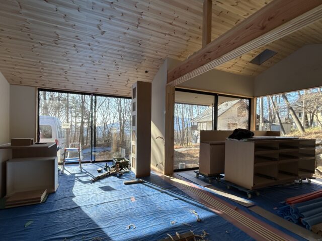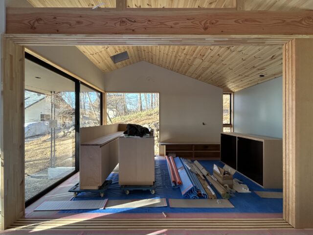 天井の羽目板張りも完了しています。この後、壁の石膏ボード張りを進めていきます。空間の雰囲気がだいぶ掴めるようになりました。