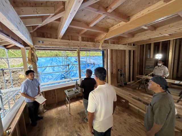 夏の工事自粛期間があけて現場では工事が再開しています。建主にお越しいただき、上棟した現場を見ていただきました。