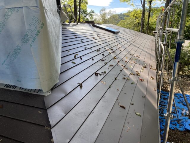 現場では屋根のガルバリウム鋼板葺きや外壁の透湿防水シートの施工を進めています。