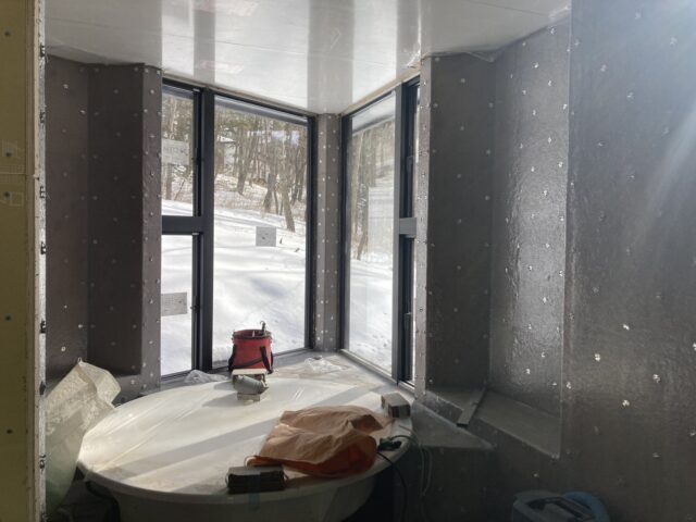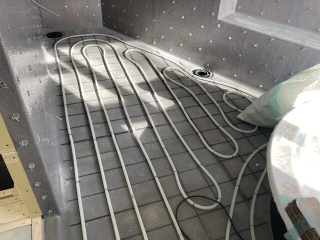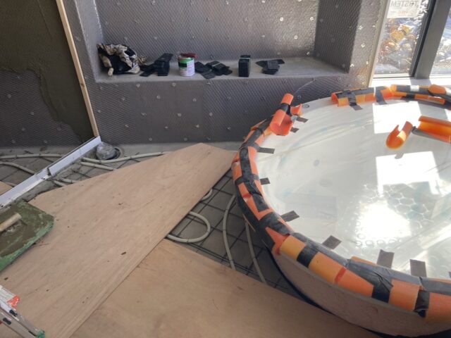 浴室は洗い場の床暖房の配管が敷設されて、大きな浴槽も据えられています。この後蓄熱層となるモルタルを充填して、タイル工事へと移っていきます。