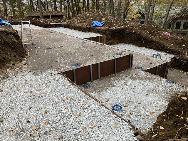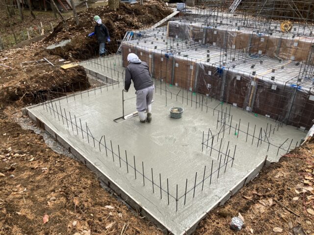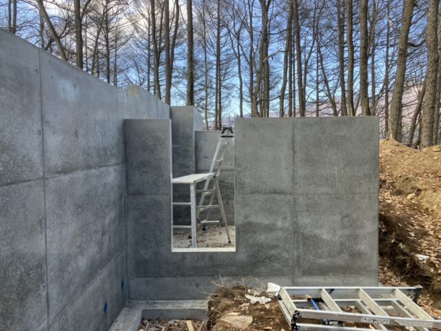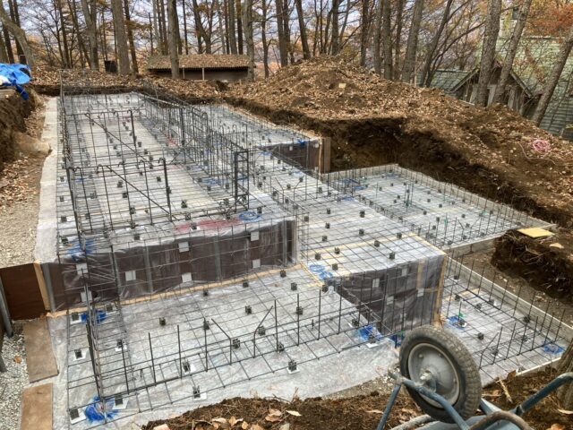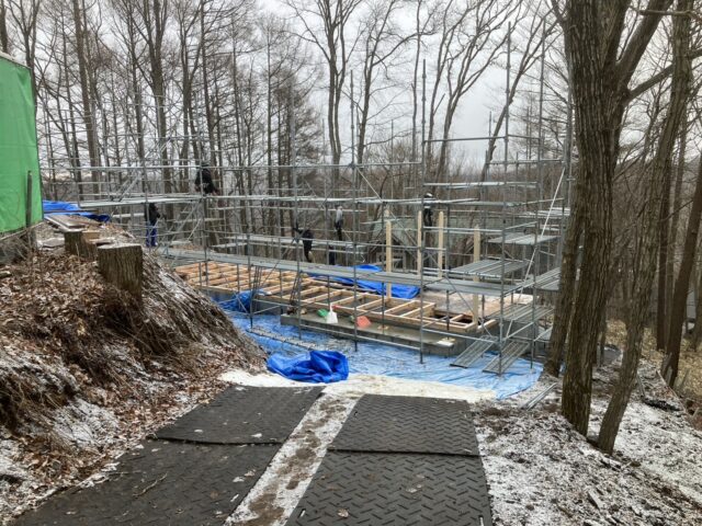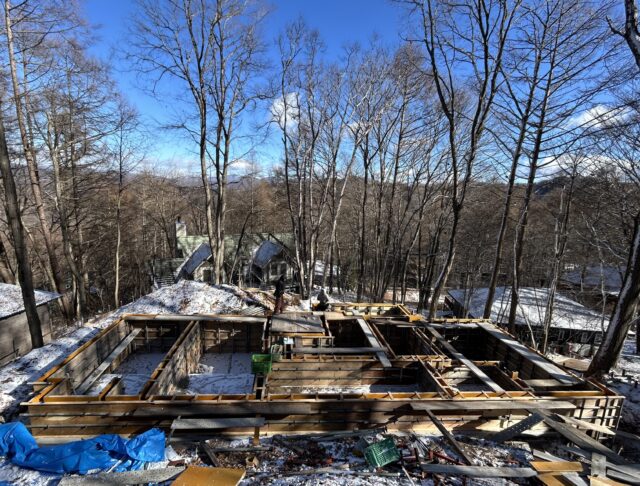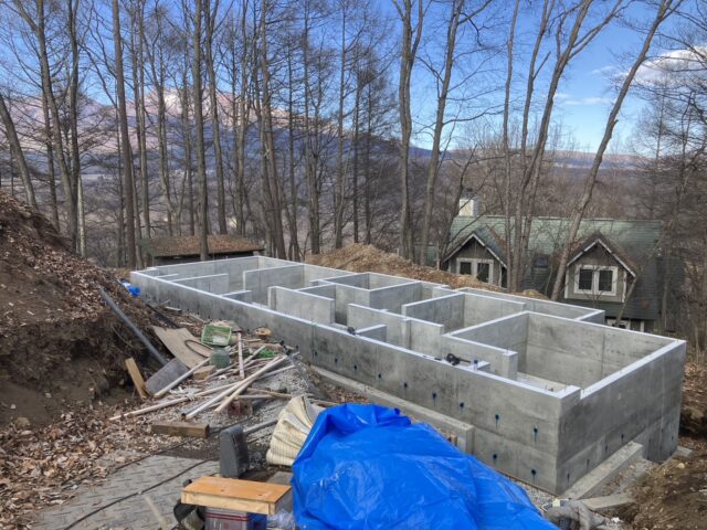 型枠がばらされて、基礎の全景が見えます。落葉した木々の向こうには浅間山が臨めます。