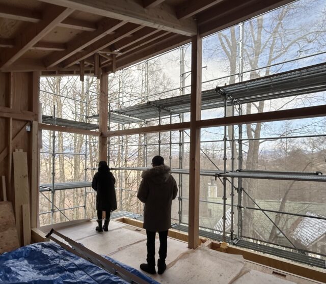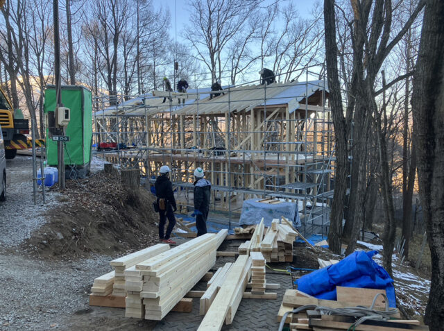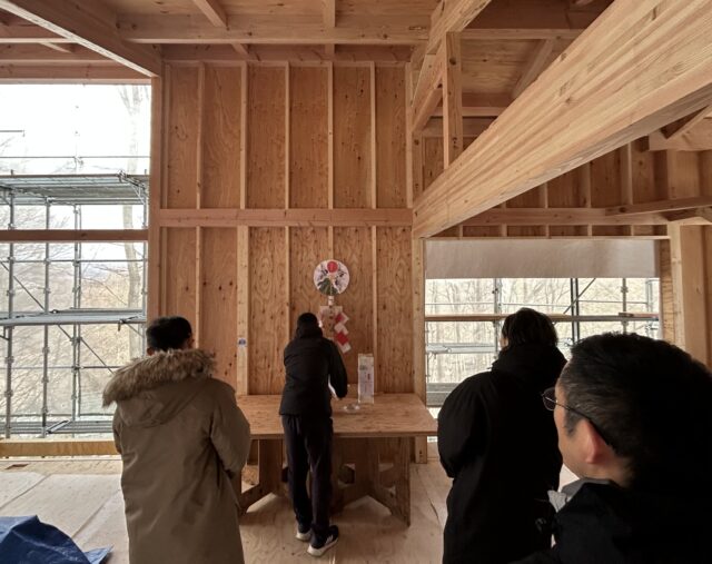日中でも氷点下5度を下回るほどの寒さの中、ご夫妻にお越しいただき関係者で上棟式をとり行いました。この後、順次サッシの取り付けを進めて行きますので、作業環境もよくなっていくことと思います。