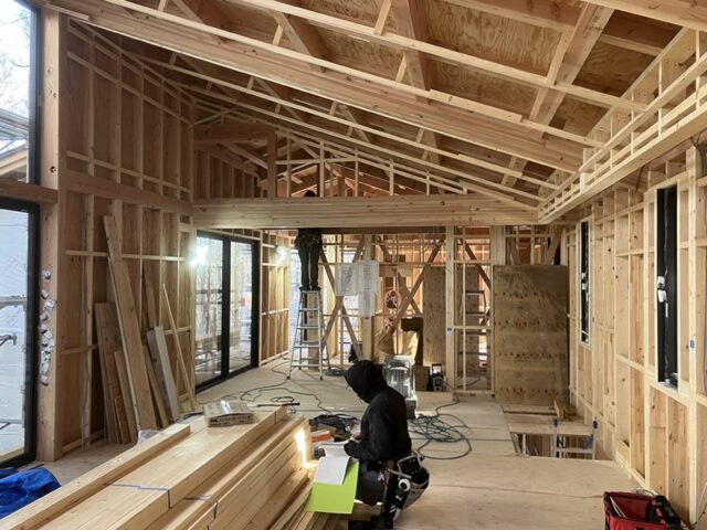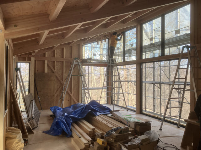 それでもご覧のようにしっかり防寒対策をしながらの仕事です。この後、電気の先行配線工事が済み、吹き付け断熱工事が終わるとさらに室内の作業環境はよくなります。