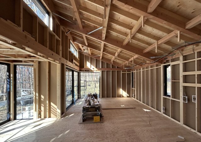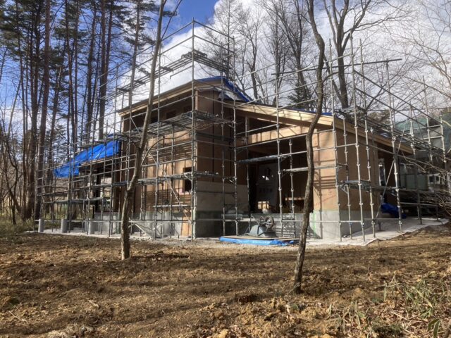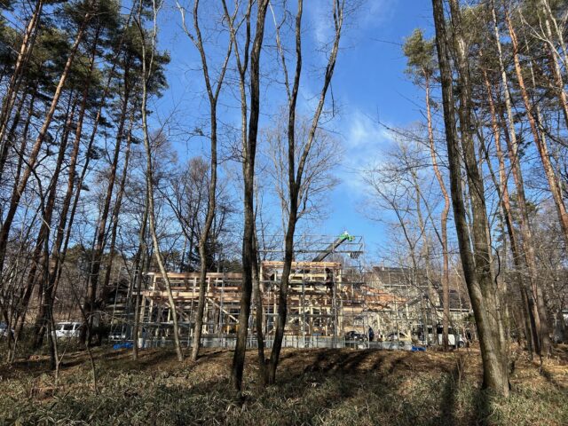 風もなく、建て方日和です。この後、屋根まわりをまとめていきます。
