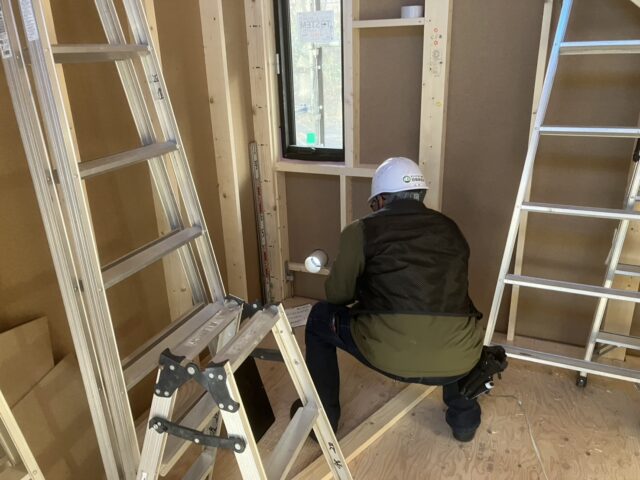 現場ではサッシの取り付けが終わり、木工事を進めています。