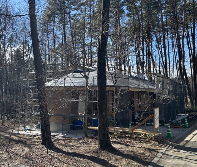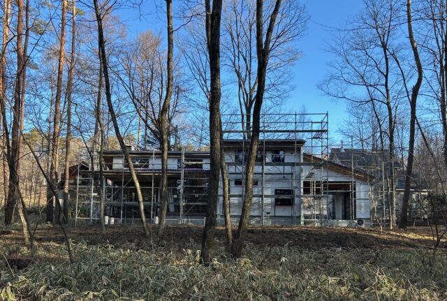 北杜市や管理別荘地への各種申請も終わり、伐採が完了した現場であらためて地縄を張り、建物配置や設計G.L.の確認を行いました。