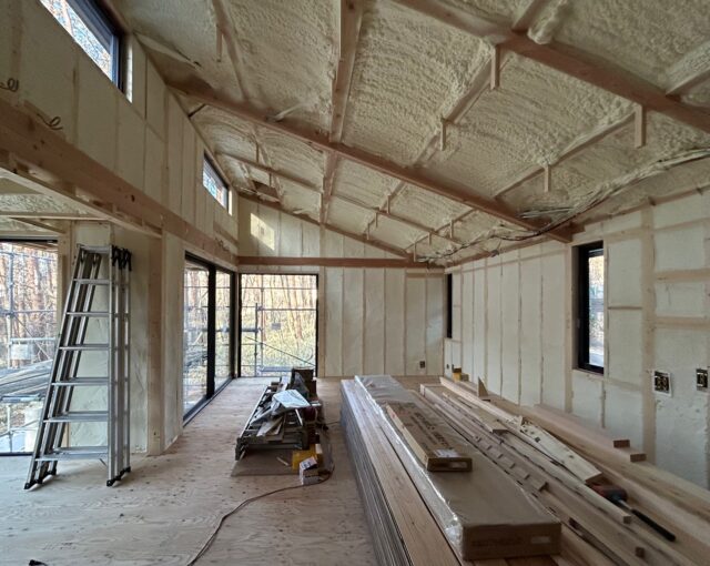 液体を霧状に壁や天井に吹き付けて、発泡・硬化させて隙間なく密着させる高気密・高断熱な施工法です。発泡しながら木材に密着するため気密性も高まります。