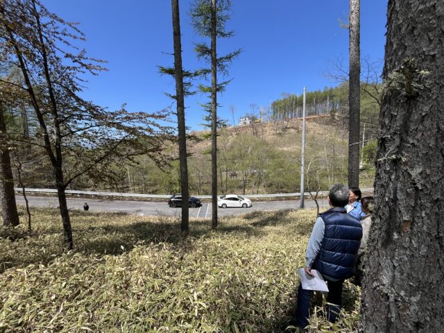 建築敷地としては急傾斜地と言えます。オーナーの希望は遠く見通す中央アルプスの眺望を活かすことです。眼下の清流からはカジカカエルの鳴く声が聞こえてきます。