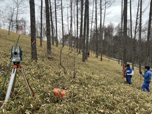 現地ではこの春の着工に向けて、地縄張りをしました。敷地は急傾斜地、いつもよりはさすがに時間がかかりました。