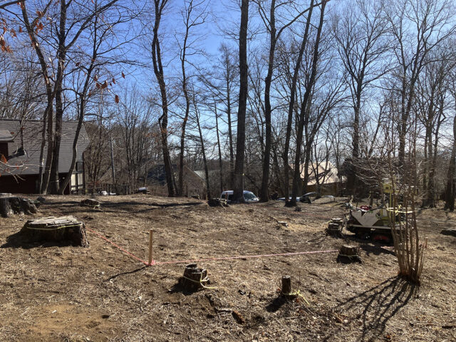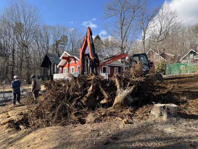 クレーン作業による伐採が終わった後に建物周りや駐車スペース、玄関へのアプローチ通路など支障のあるところは抜根まで行います。大木も多く、根っこもかなりのボリュームになります。