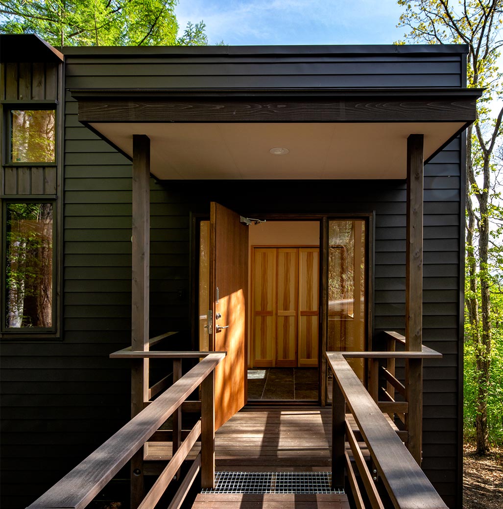 階段を下りていくにしたがって眼前に森風景が拡がっていく、ダイナミックな縦空間移動に非日常感があります。