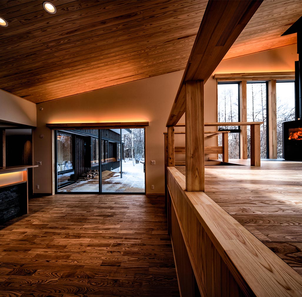 深い森の中ですから南に開く片流れ空間でも、陽が入りすぎるということはないでしょう。